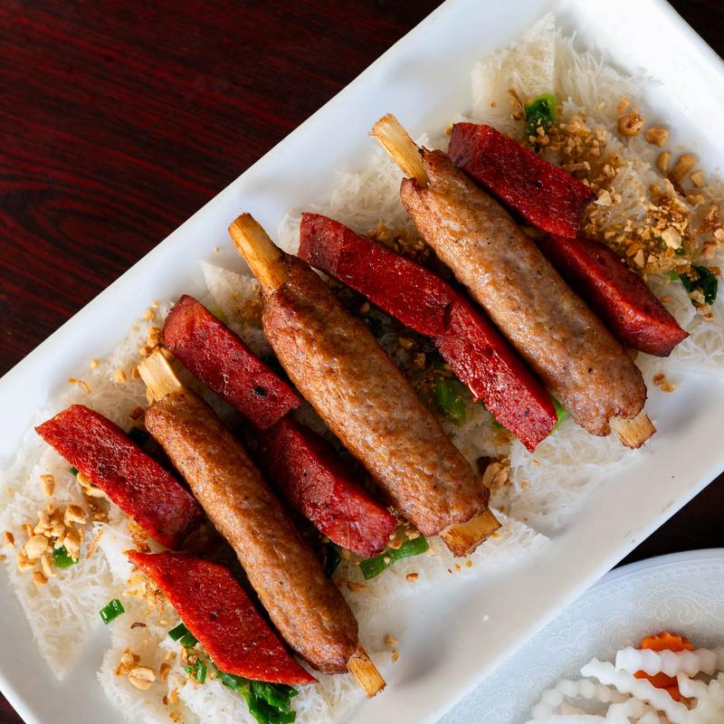Chargrilled Vietnamese sausage and shrimp paste with ground pork wrapped around sugar cane with vermicelli