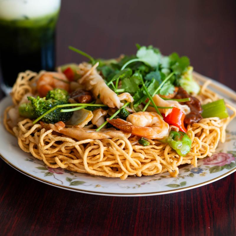Stir fried chicken, seafood with vegetables over crispy deep fried egg noodle
