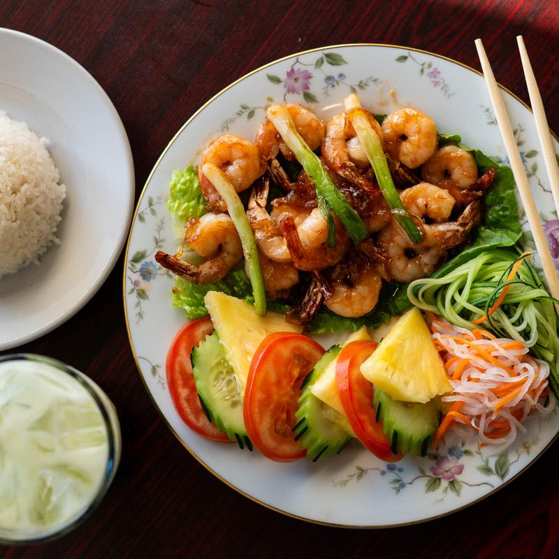Chargrilled shrimp paste wrapped around sugar cane served with thin flat vermicelli, lettuce, mint leaves, cucumber, pickles and house special fish sauce