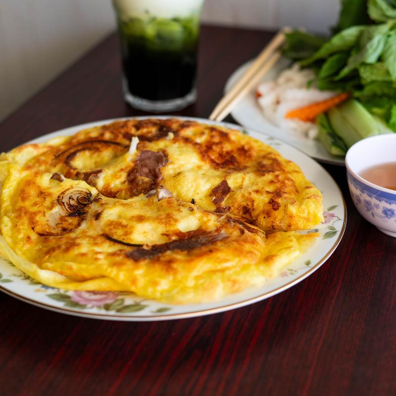 Crispy pancake stuffed with shrimp, pork, onions and bean sprouts