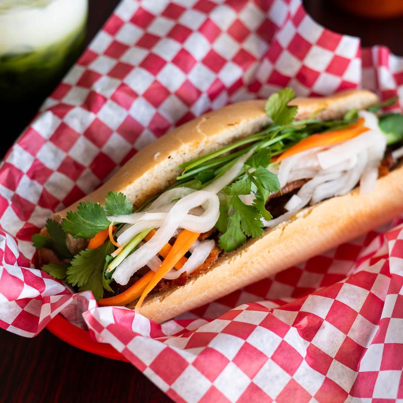 Special sandwich with BBQ pork, Vietnamese pork rolls and fried egg
